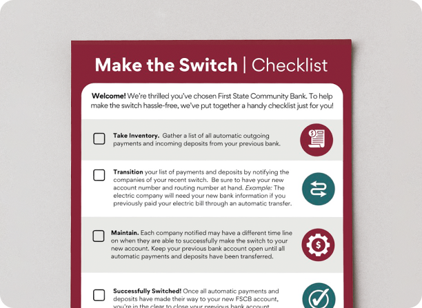 © 2025 FSCB - All rights reserved Bank NMLS 412605 Backed by the full faith and credit of the U.S. Government. First State Community Bank is not registered as a broker-dealer or investment advisor. Investment products and services are offered by First State Financial Management through the registered broker-dealer NBC Securities. Any products and services offered by FSCB are separate and distinct from those offered through NBC Securities.